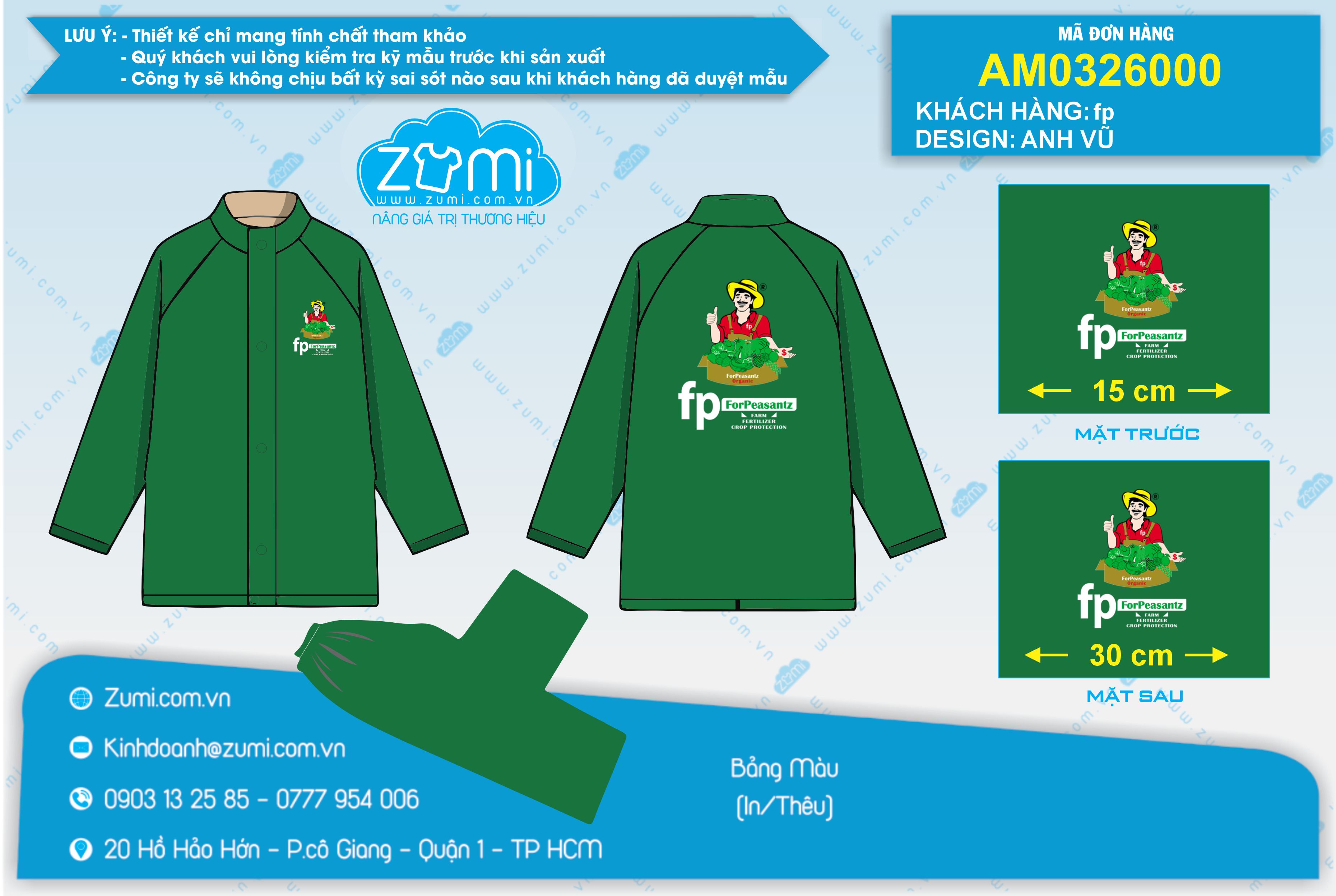 Mẫu áo mưa bộ có túi do Zumi thiết kế và sản xuất cho công ty Forpeasantz là sản phẩm áo mưa đồng phục cao cấp, được tối ưu cho đặc thù ngành hàng xuất nhập khẩu. Với thiết kế chống thấm toàn thân, chất liệu bền chắc và tính tiện dụng cao, áo mưa công ty Forpeasantz giúp nhân viên làm việc an toàn, sạch sẽ trong môi trường khắc nghiệt, đồng thời góp phần nâng cao hình ảnh chuyên nghiệp và tăng độ nhận diện thương hiệu ngay tại hiện trường.
