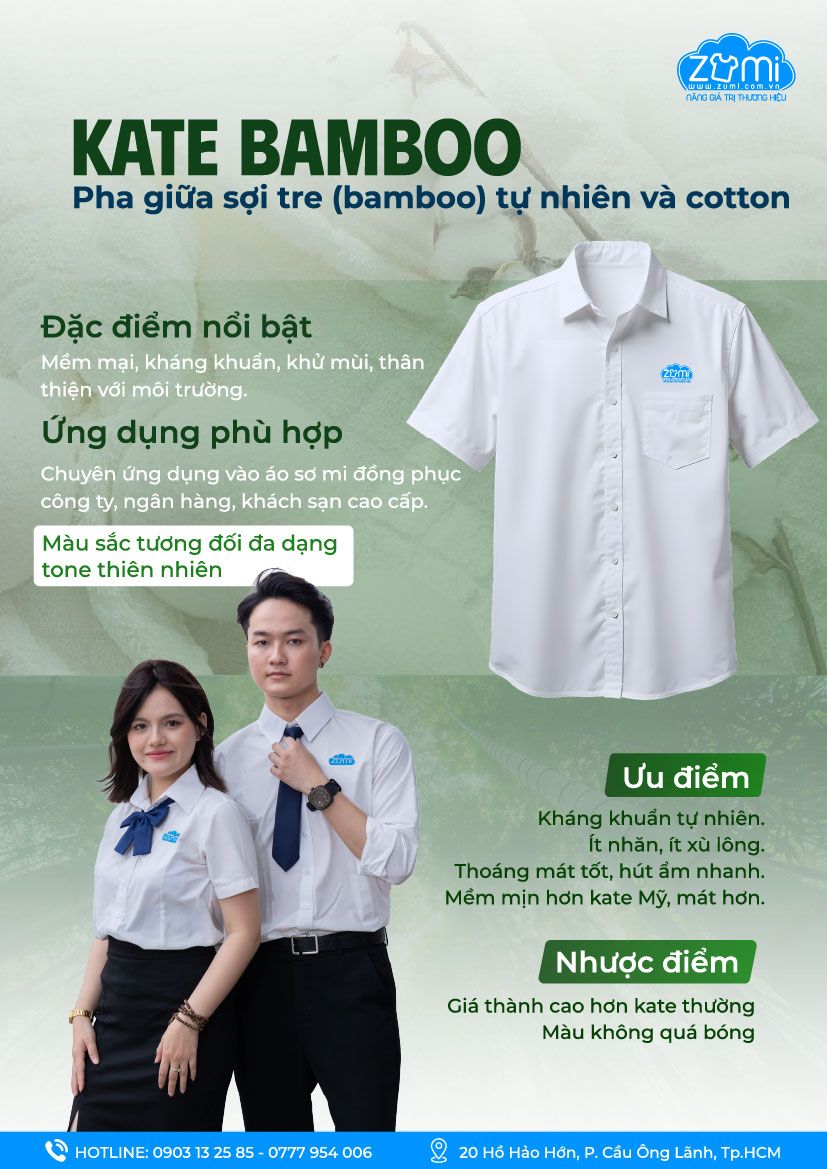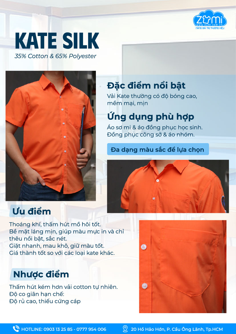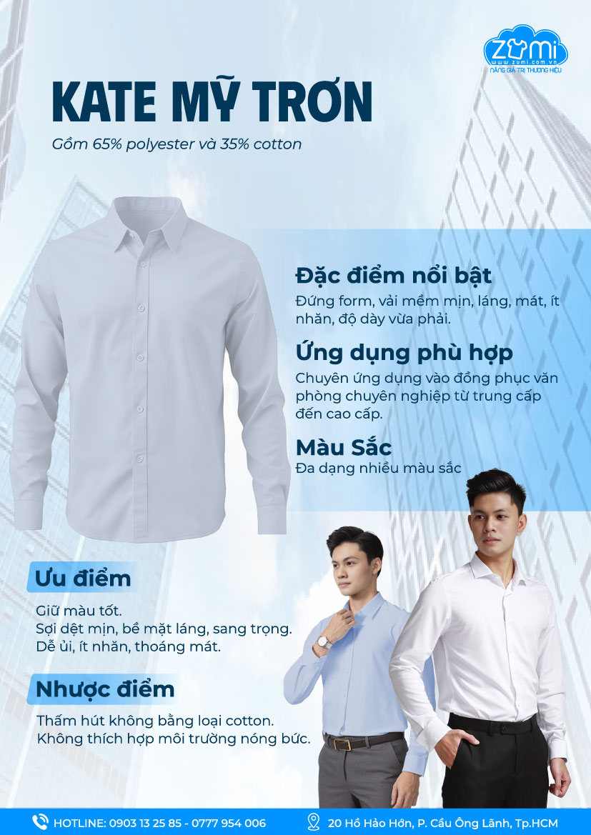 Chất liệu cao cấp: Sử dụng vải kate chất lượng cao – mềm mại, thấm hút tốt, ít nhăn, tạo cảm giác dễ chịu trong suốt ngày dài làm việc, kể cả khi di chuyển nhiều.