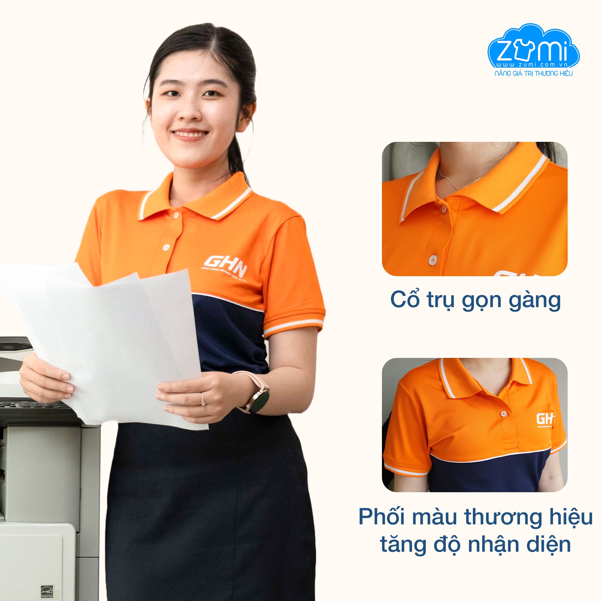 Với mẫu áo polo GHN do Đồng Phục Zumi thực hiện, phần phối màu thương hiệu được xử lý tinh tế, đảm bảo vừa nổi bật vừa không gây rối mắt – đúng tinh thần chuyên nghiệp của doanh nghiệp logistics.